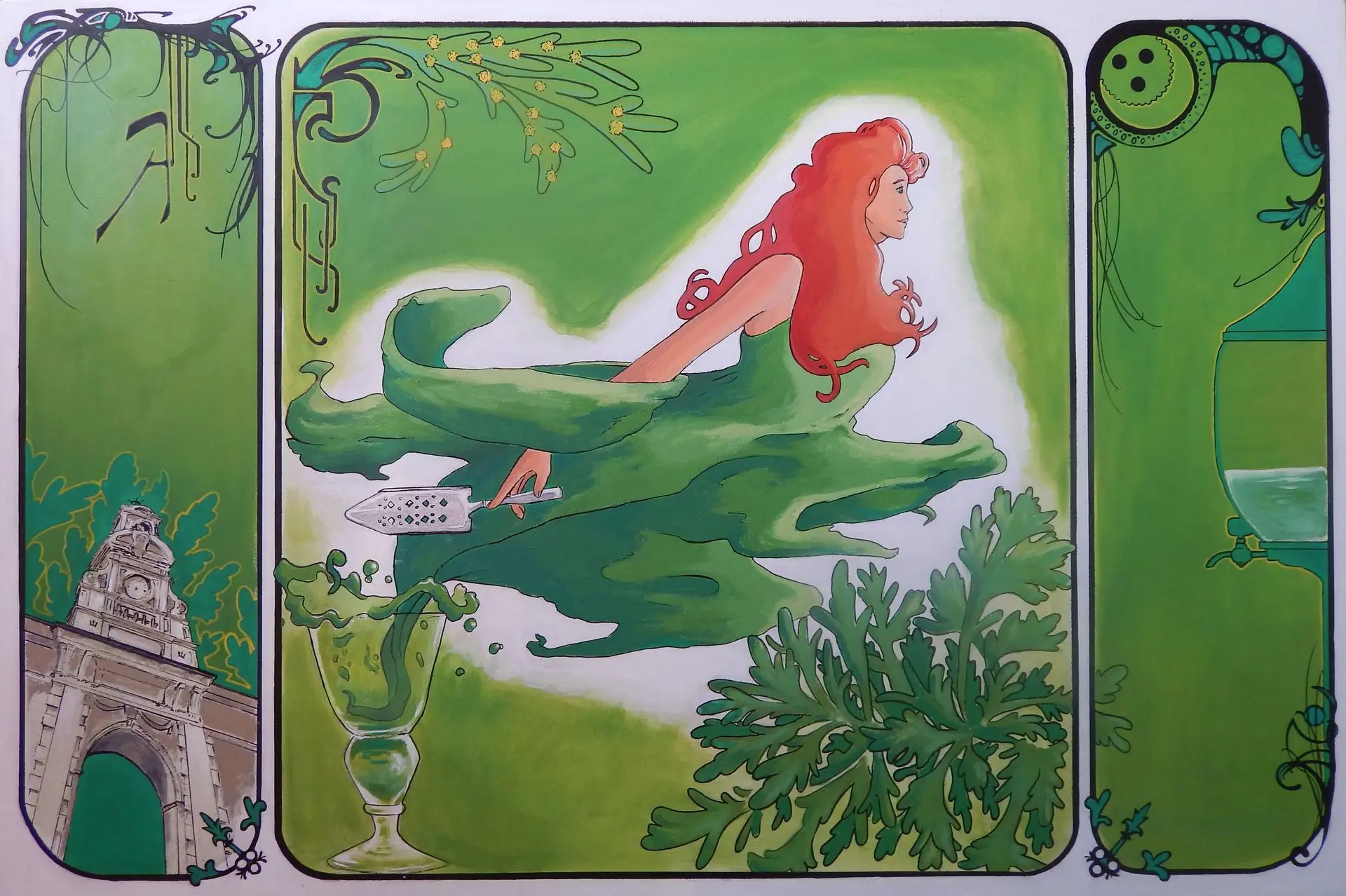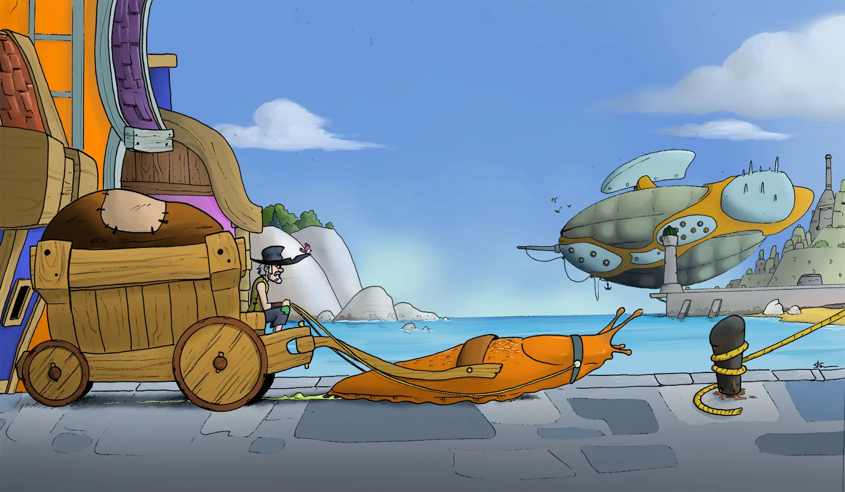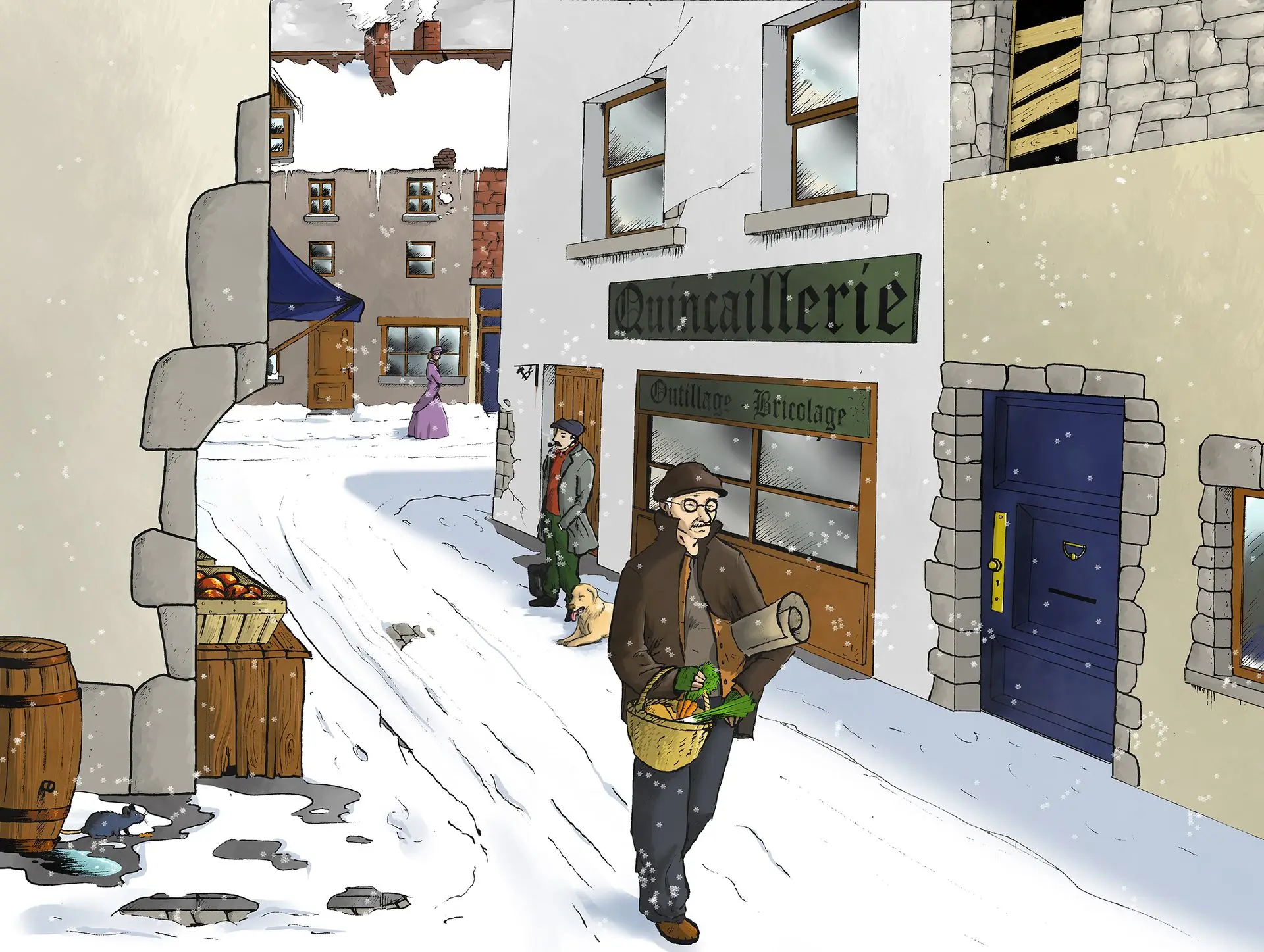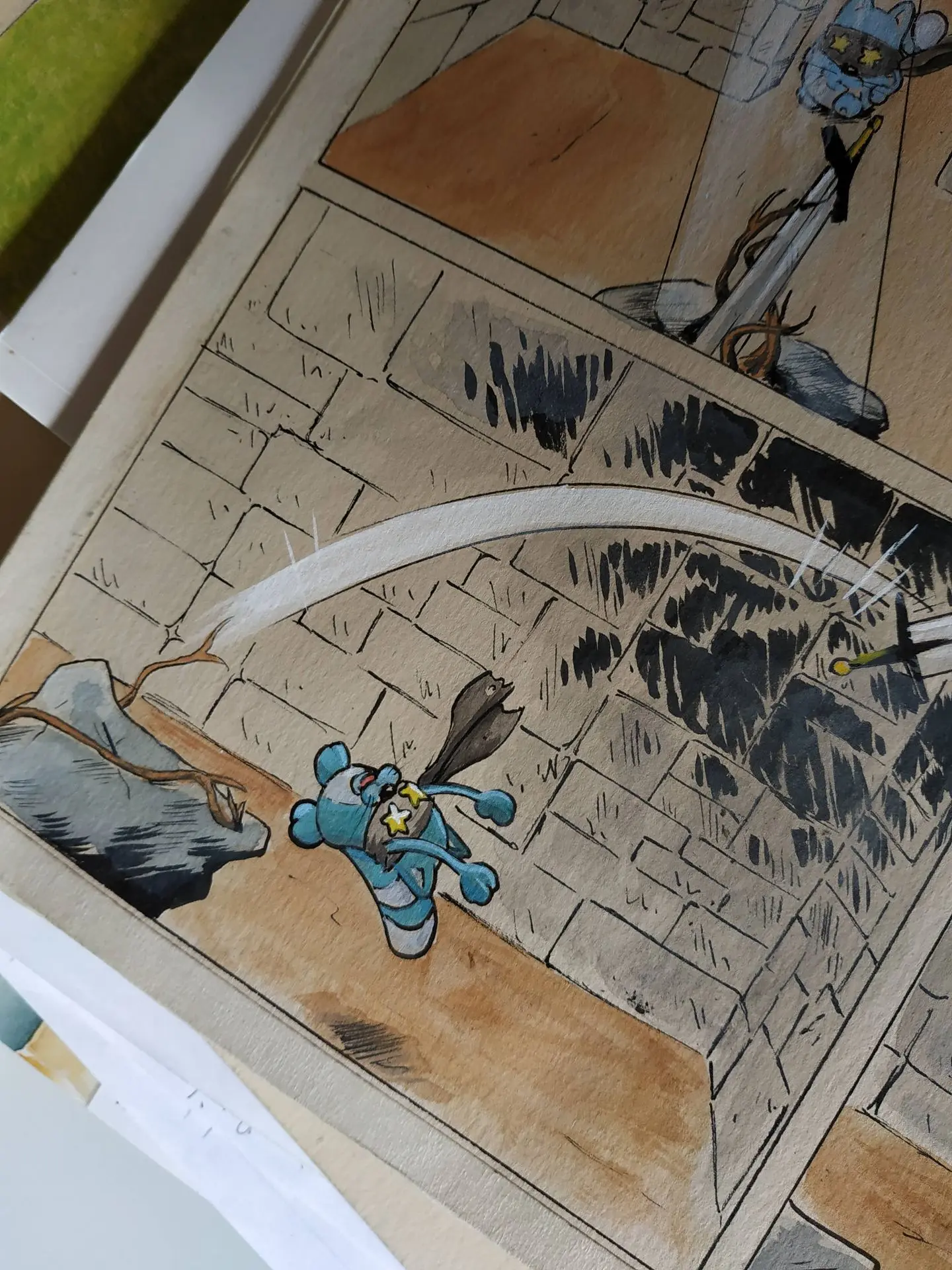 différents croquis et esquisses puis l’encrage et la mise en couleur.